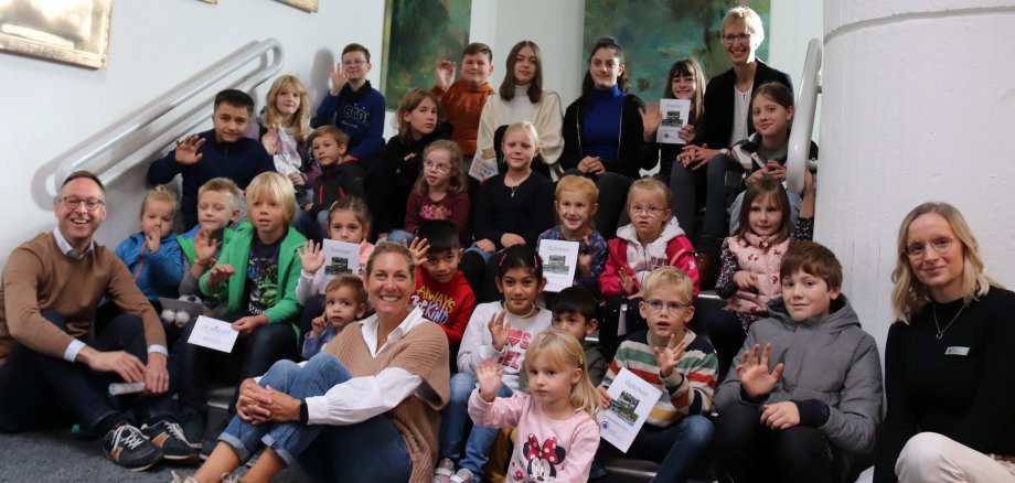 Bildzeile: 25 Kinder und Jugendlichen konnten sich im Rathaus ihre Gewinne aus der Rallye vom Familienfest am 4. September abholen. Die Gewinnübergabe war der Abschluss der Jubiläumsfeierlichkeiten des Jugendamtes.