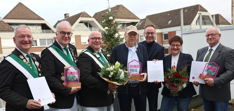 Bild (v.l.n.r.): Preisverleihung im Rathaus: Carsten Recker, Reinhard Bänisch und Guido Lütkewitte (Schützenverein der Landgemeinde Rheda e.V. „Bauernschützen“), Alwin Wedler sowie Diana Brand und Norbert Falkenberg, (WCV „Grüne Funken“) freuen sich über Plakette und Urkunde des Heimatpreises, die Bürgermeister Theo Mettenborg (hinten) ihnen überreichte.