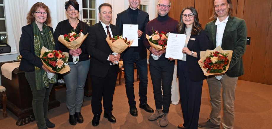 Bild vlnr: Mariette Rüschoff, Anja Frerich, Davut Aslan, Bürgermeister Theo Mettenborg, Tobias Wellerdiek, Fama Diksu, Jörg Droste bei der Verleihung des Integrationspreises 2025.