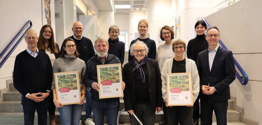 Bild: Verleihung der Westenergie Klimaschutzpreise 2025 im Rathaus durch Bürgermeister Theo Mettenborg und Westenergie-Kommunalmanager Thorsten Hildebrandt. Vorne von links: Heinrich Splietker, Kathrin Gerhard, Norbert Walgern, Hans Schalück, Katja Schröder und Theo Mettenborg. Hinten von links: Annika Holthaus, Thorsten Hildebrandt, Gertrud Walgern, Anni-Lotta Hamer, Gabriele Walgern und Sarah Walgern.