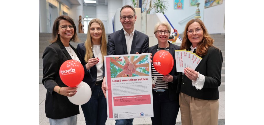 Bild: Bettina Zodrow, Izabela Ciecierska, Bürgermeister Theo Mettenborg, Fachbereichsleiterin Claudia Brügge-Siebelhoff und Helga Kuhn vom Personalservice der Stadtverwaltung laden alle zur Typisierungsaktion im Foyer des Rathauses ein.