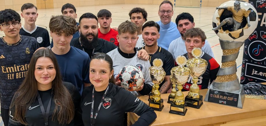 Titelbild: Kämpften zusammen mit ihren Teams in den Nachtstunden von Freitagabend bis zum frühen Samstagmorgen in der Moritz-Fontaine-Gesamtschule um den „Fair Play Cup“ des Städtischen Jugendzentrums: Die Kapitäne der teilnehmenden Mannschaften mit den Turnier-Organisatoren und Bürgermeister Theo Mettenborg.