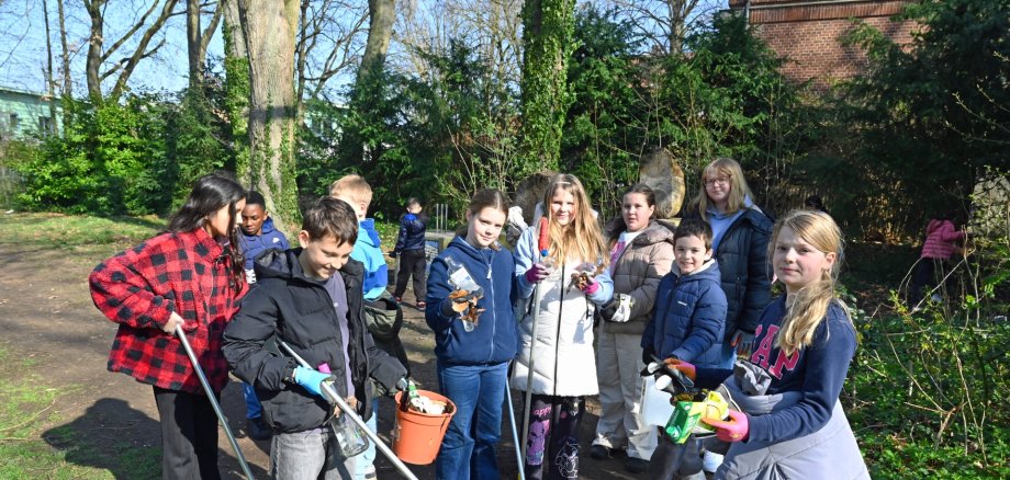 Am traditionellen Stadtputztag nahmen bei bestem Wetter 1250 Personen teil, knapp 100 mehr als im Vorjahr. Mehr als 700 Schülerinnen und Schüler hatten schon in der Vorwoche angefangen, Straßen, Wege, Böschungen und Waldstücke rund um ihre Schulen von Müll zu befreien. Alleine die Eichendorff-Postdammschule war mit 170 Kindern im Einsatz. Die Klasse 4b sammelte an der Bielefelder Straße mit ihrer Lehrerin Marion Bremke. Die Kinder hatten sich zuvor im Unterricht intensiv mit dem Thema Umweltschutz beschäftigt und waren sehr interessiert. Sie waren erstaunt, verwundert aber auch wütend, dass sie direkt in Schulnähe viel Müll aufsammelten, obgleich zwei Tage zuvor schon eine andere Klasse in dem Bereich unterwegs war. „Zigarettenkippen regen mich immer total auf“, meint Hana, weil sie überall herumliegen und sie schwierig aufzusammeln seien. Ben meint, dass man Müll am besten richtig entsorgen sollte, damit er recycelt werden kann und Kimberley fügte spontan hinzu: „Wer dafür ist, dass Müll in die Tonne gehört und nicht ins Gebüsch, Finger hoch“. Und das tat ihre Klasse auch einstimmig.
