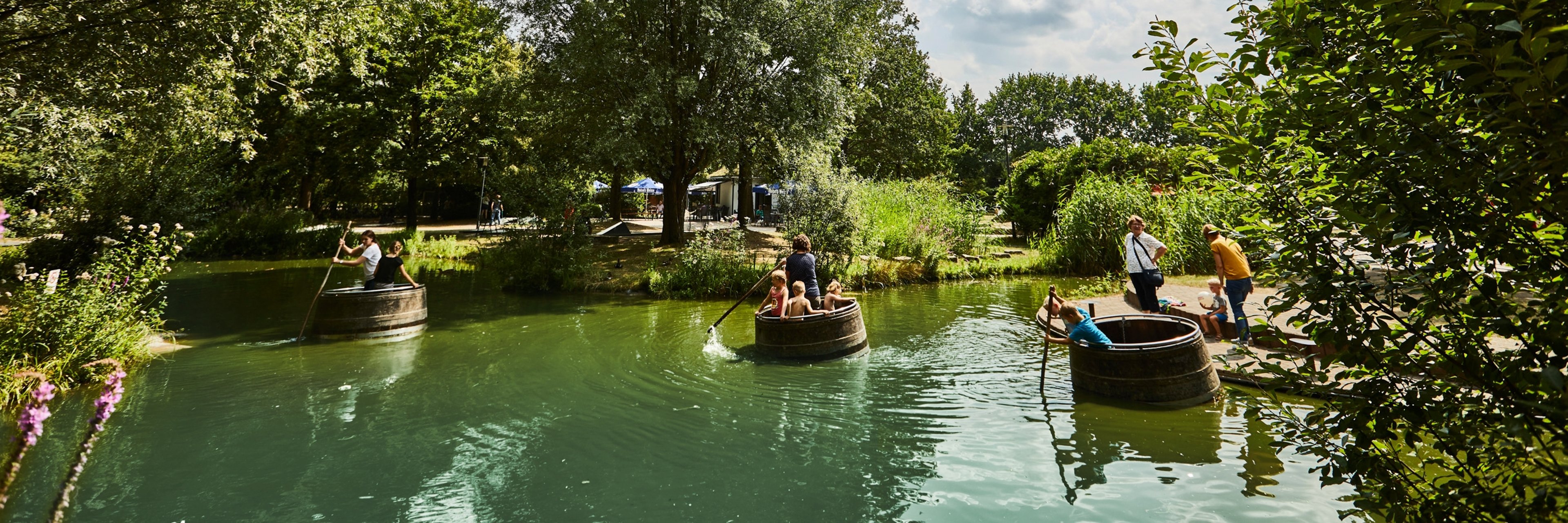 Auf dem Spielteich sind die Nachwuchskapitäne bei der Bottichfahrt gefragt, und auf der Streichelwiese freuen sich die Ziegen über kleine Schmuseeinheiten.