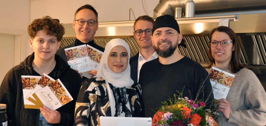 Bildzeile v.l.: Mohamad Almousslli, Bürgermeister Theo Mettenborg, Reem Ayasso, Wirtschaftsförderer Sebastian Czoske, Wiaam Almousslli und Ann-Kathrin Wierling aus der Stadtplanung in „Wiaam’s Kitchen“.